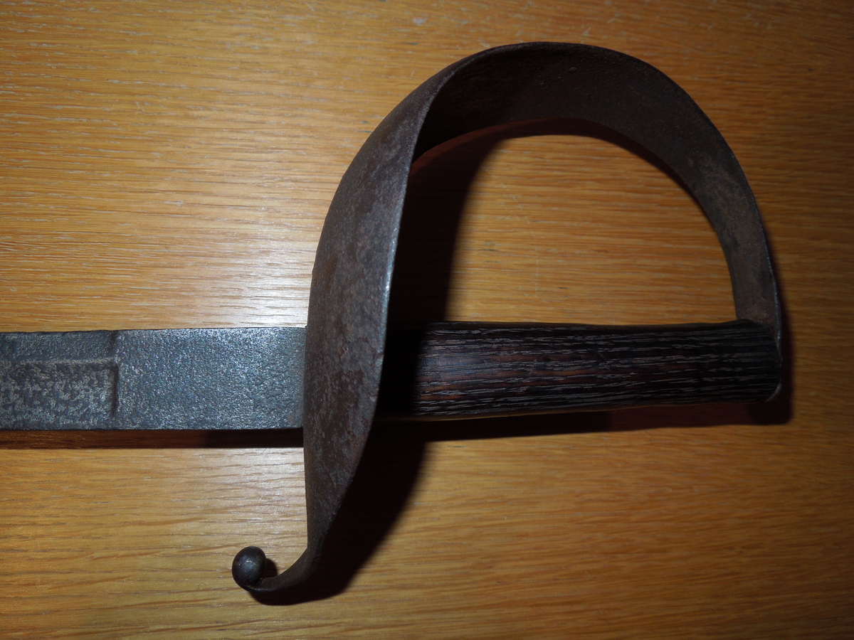 This sword came in a very rusty condition but cleaned up quite well, which unfortunately revealed no markings at all. I thought it was a cutlass at first but now I'm thinking it may be shortened from a longer sword.