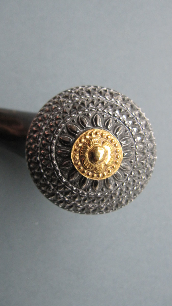 Possibly Sumatra (from the style and materials of the scabbard), similar in shape to a pichangatti, perhaps a type of wedung? 38 cm out of its sheath. The base of the blade decorated with indentations similar to greneng on a keris blade, horn hilt, the foot of the sheath and the top of the mouthpiece each with a plain thick plate of copper.