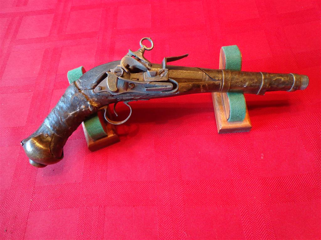 Here is a pistol that has seen a LOT of action and use. It's just barely held together. LOL After studying this for a while, here is my assesment:I believe this gun started life as a Spanish made pistol from about the first quarter of the 19th Century. And somehow ended up in North Africa, probably Morocco. Lock: Typical Spanish miquelet pistol lock from the early 19th Century. No marks on the lock inside or out. I can't believe it's still in working order with an old original flint and leathers. Stock: There is a large break at the wrist area that was repaired with leather a long time ago. The butt cap area was originally longer but had been broken off and a brass butt cap just crudely nailed in place. The cap is not a casting and looks like it came from another Balkan type pistol. The barrel tang screw goes through the top and threads into the trigger plate ala European style. There was originally a full length ramrod hole/channel cut. The brass Spanish style side plate is missing. The long barrel band and trigger guard are made very typical of Moroccan guns during this period. Barrel: The barrel is likely Europen and originally of decent quality. The breech plug/tang integrity tell me this. Although Spanish made barrels usually have at least some markings, there are none on this barrel top or bottom. I can't detect any signs of damascus. But I still thing the barrel is European and originally built with the pistol. The barrel and lock look to have been chemically cleaned at some point in the recent past. While there is little collector value in this piece, I think it is a good example of how areas of North Africa would cobble together most anything that could be made to shoot. It would be interesting to know everywhere this pistols been, LOL Any way, picture heavy and hope you enjoy. Comments always appreciated. And thanks for looking. Rick |