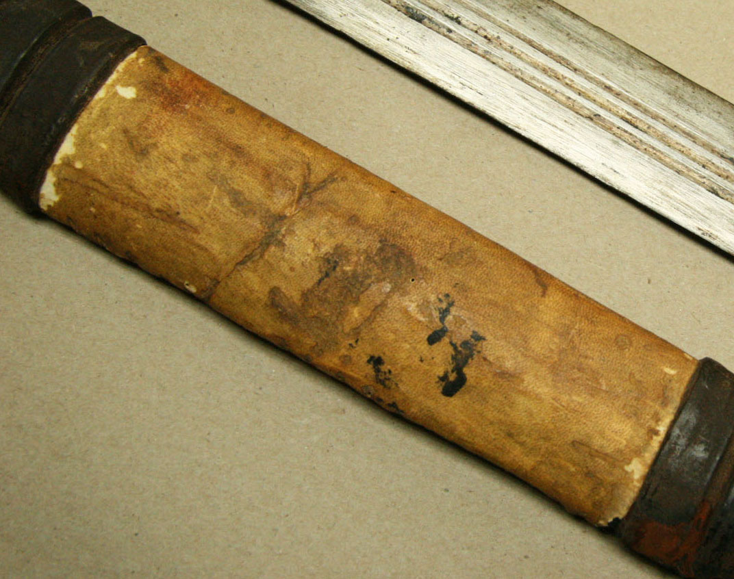 The blade is 84 cm long, 4.5 cm wide. Sword is 98 cm long overall. The scabbard is wood, covered with three sections of tooled leather, and two sections of very fine calf-skin, or similar finely-worked leather, something I haven't seen before. Hilt is completely wrapped in leather and oil-cloth. Blade is somewhat flexible, but not easily bent, and has a nice temper, with no markings of any kind. By the looks of it, I would say it dates to some time in the 1800s.
