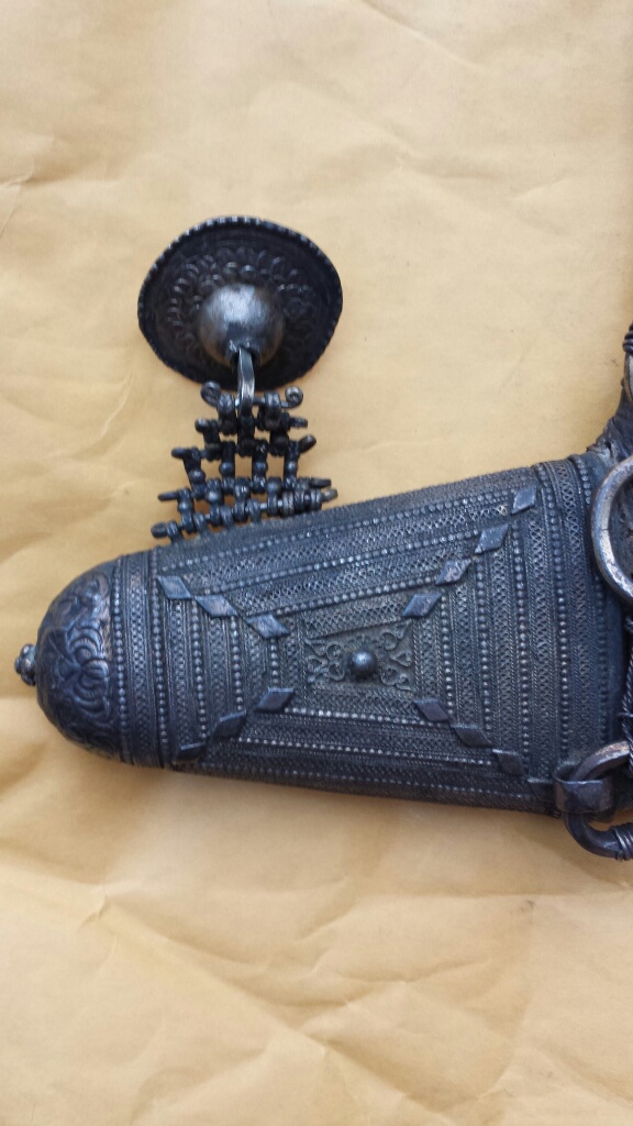 I picked up this silver Jambiya scabbard recently. Sadly no Jambiya to go with it, but the price was too good to let go. I know little about Jambiya and hope members here can tell me a little about what I have. Is it a quality piece, or average? The metalwork seems quite intricate. It has seen a little damage and there are obviously a few pieces missing (including the knife!), but overall I find it a rather attractive item. As usual, all thoughts and comments are welcome and appreciated. Cheers, Russel |
