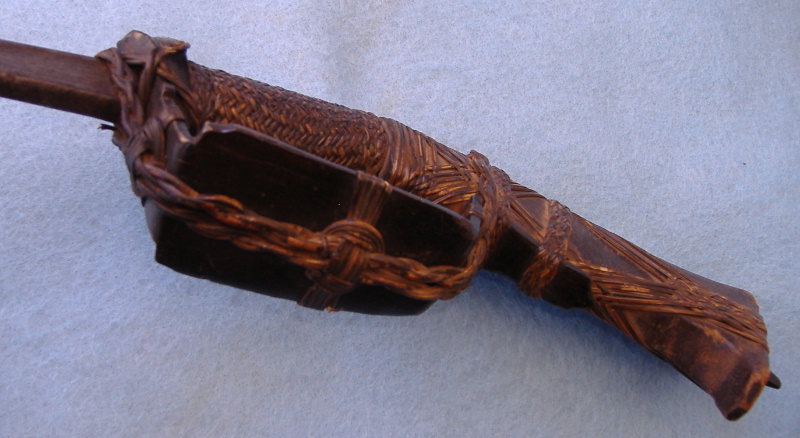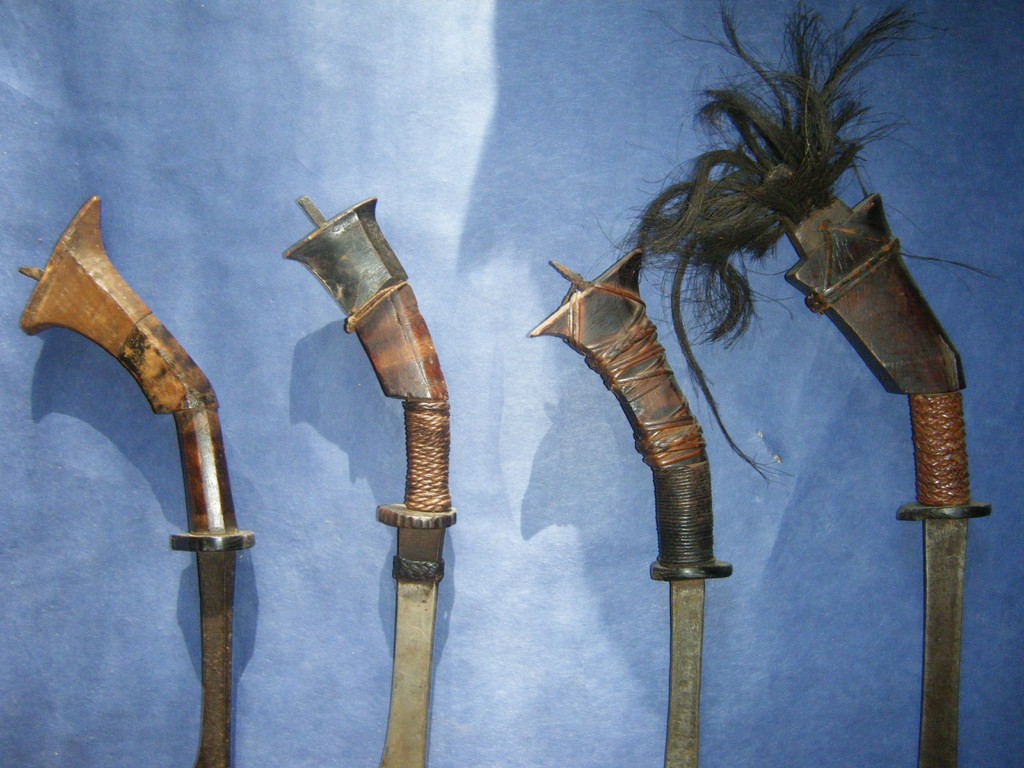 Here are two more examples, just for comparison. One has a quite unique hand guard made from horn added on to the hilt and attached with woven rattan. It likely had an additional pommel that is missing.
