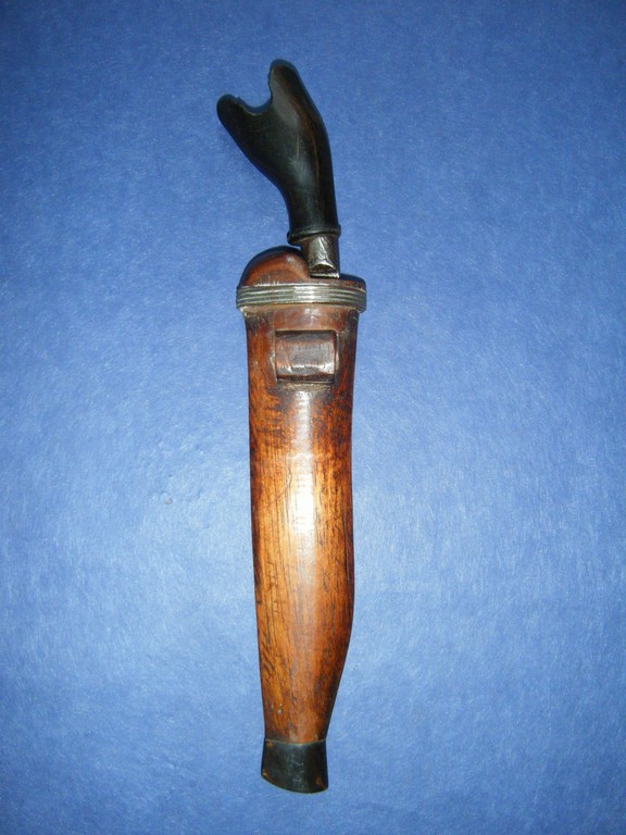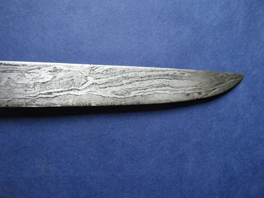 Have get also this Indonesian dagger, the blade shape is very similar like a sewar blade but missing the blood groove all my sewar show and the blade is a little bit broader as my sewar blades and the scabbard is complete different but could be an old replacement. The blade I've cleaned a little bit from rust and show a nice pamor but again very different from the sewar blades I know which show a much finer lamination. The handle is of the hulu rumpung form (see Zonneveld, page 55). Would like to know if this is a dagger with a own "name" or if it is a unique piece. Sorry for the bad picture quality, the weather is not good enough to take better ones.