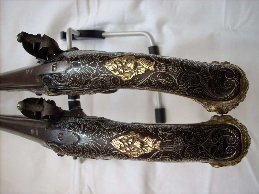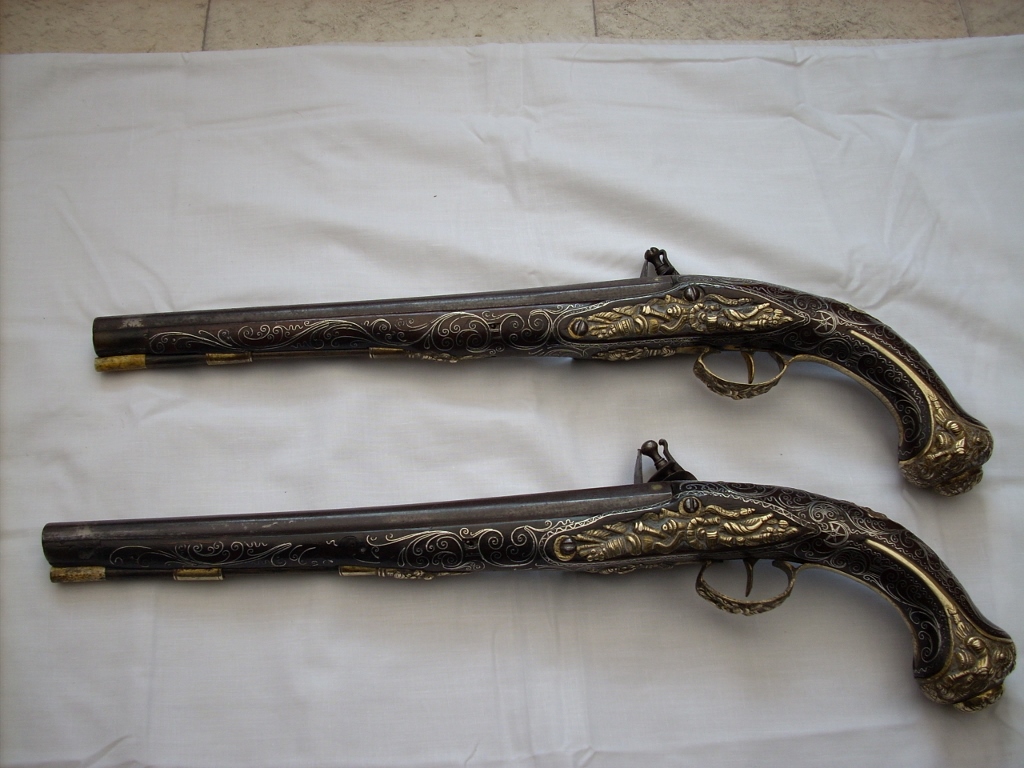 I was told by the Dealer, when I purchased them, that they were Turkish and that is all I know. They both carry clear stamps on the barrels and have the word `ROSSI` stamped on the lock plate. The fittings look like gilded brass or bronze and the stocks are decorated with silver wire. The ramrods are dummies made from wood with bone sleeve at the end. From the light patch in the patina at the muzzle end of the barrels it looks as though they may be missing a band for decoration and or securing the barrels.