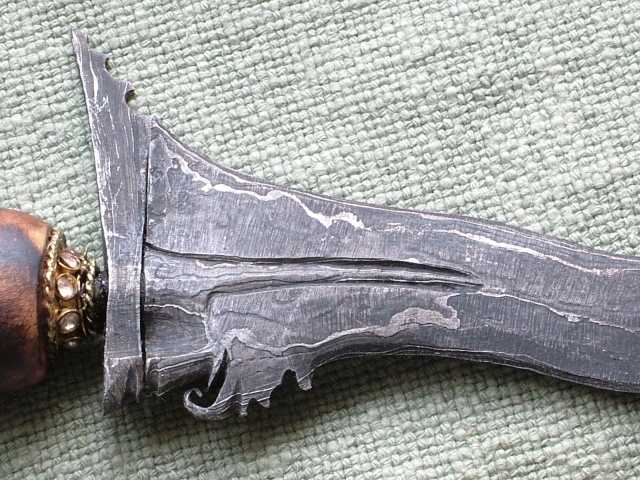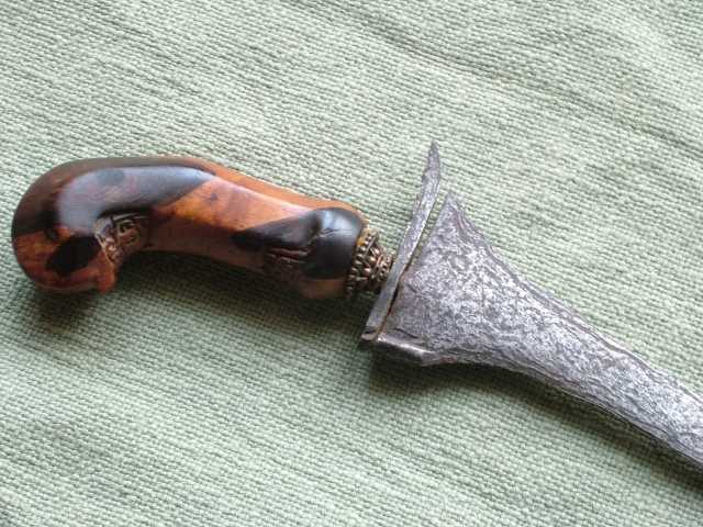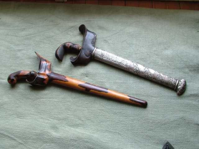 Here is the story: Few years ago when I started to collect swords I found a keris and I got it, mainly because I liked the strange wood of the scabbard and I still do. For years now I read sporadic in this forum posts about keris but I gave no special attention to them, as my interests turn to other part of world. Few days ago, as I was walking in a small street of Athens, I saw a keris in a little shop. I went in and my first question was "do you have any other swords?". Seller said no, so I ask to hold the keris, that from far it was looking too fancy to be old. When I hold it I felt it was a fair construction of some age, but still I was not interesting, mostly because I prefer to spend my money to other kind of swords. Also Athens antique shops are not cheap. Blade was totaly black and seath cover was looking silver but I was not sure at the time. As I turned it the other side I saw a tag for a ridiculus low price! So I couldnt regist to take it. It could be a present to friend. I even bargain and made the price low as a McDonald meal! Back home I tested the cover of the scabbard and it was silver. I eched the blade with my favorite vinegar (I hope this is not a crime for the purists) and voila! Pamor (?) is here. The ganja (?) thing had glue (!) and I cleaned it. Now I have 2 keris and I dont need both of them. But I cant decide witch of them will go. I like them both. Do you think that loving keris is a kind of contagious disease???? |