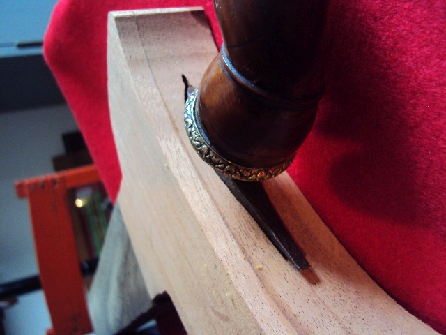 When I attached the buntut to the gandar, I used a two part epoxy glue. After that hardened, I carefully drilled four holes into the buntut from the end and glued four slender wooden dowels into place. This is to hold the job as securely as I know how. Incidentaly, the original antique piece of gandar has four little pinholes too.