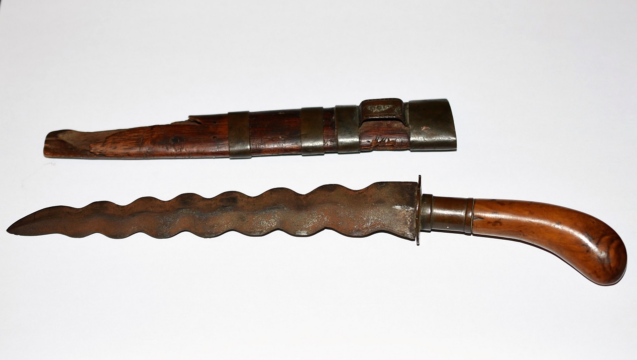 Hello everyone! I saw recent interest in gunongs and I'm sharing photos of one from my personal collection. The blade is 19 cm long and 2.6 cm at the widest end. With the wooden hilt (banati?) and metal guard, the total length is 28 cm. It comes with the original scabbard with metal rings and belt loop. However, the scabbard is damaged with some parts missing. It is estimated to be from the year 1900 or thereabouts. For reference, I've included a photo of the gunong prior to restoration. Your thoughts would be greatly appreciated.