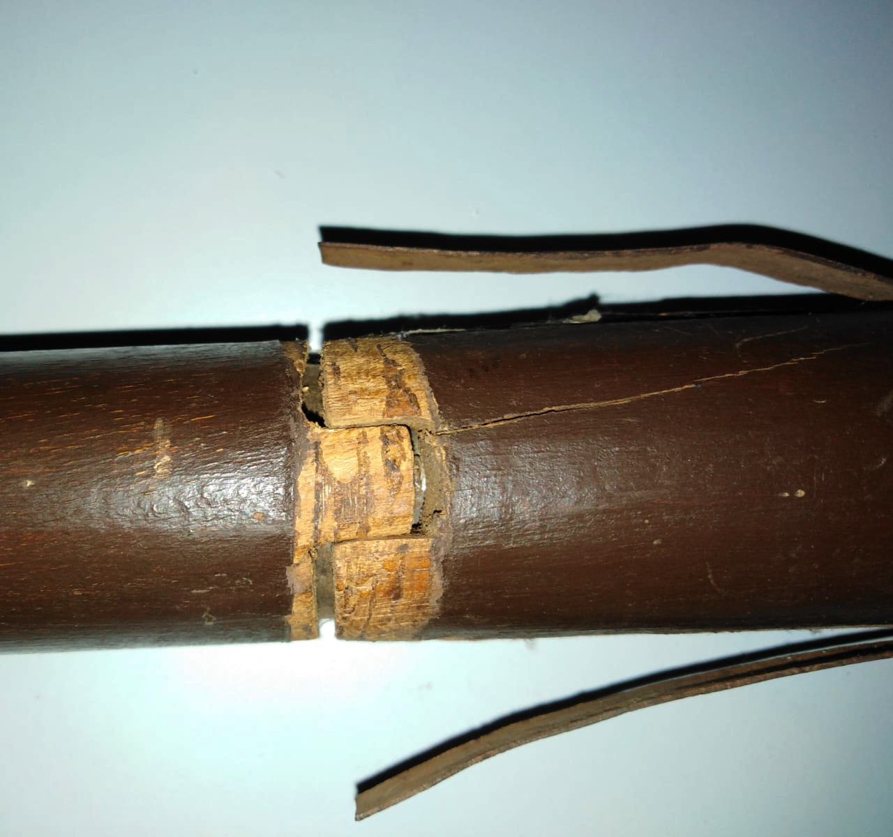 The stock is IMHO unlikely to be bamboo but rather some local wood. Rattan barrel bands are often seen on guns from this region, and also on Toradors from India. Stocks are often made in more than one part as yours would appear to be by the "dovetailed" joint you show in your pics, and these joints are usually hidden by a wide brass or iron band. A combination of barrel band material is not uncommon either. Could be a mix of iron, brass,rattan or just wire, on one gun.