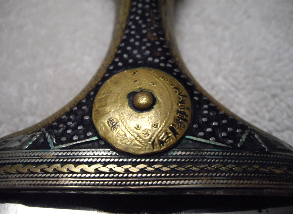 Here is a contemporary Jambiya from Yemen. On a first glance nothing special new knife, but looking closely the hilt appears to be older, with traces of silver? filigree at the base. The scabbard fits perfectly so everything was made together. Also, it appears to be fibrous structure although it is not clearly rhino to me, there are no visible "tips", etc. Would love to hear any opinion on on the hilt, age and material. Thanks much!