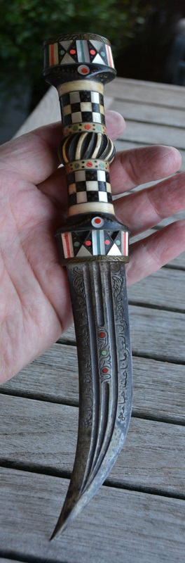 The first one is a classical type - one of the two main types produced in the village of Majdal Shams. The other type is with heavier blade and decoration/writing near the base of the blade. It is dated on the blade to 1932 in Arabic numerals. I like it better than the other one because of the quality of the blade. On the blade is a blessing - that is often the case with these inscriptions and the maker's name: Abu Ali
