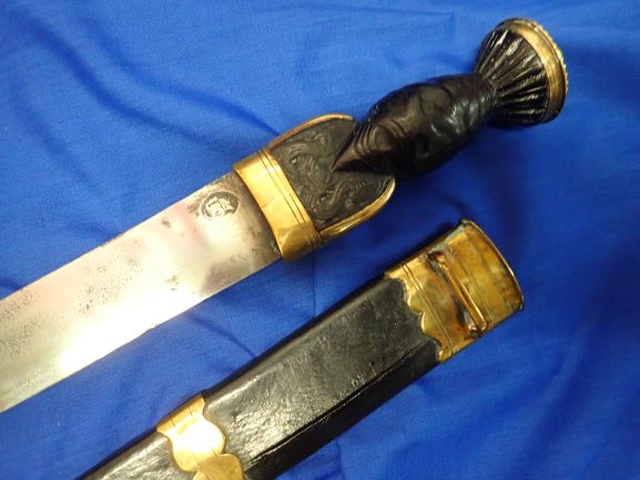 Picked up this Scottish dirk but does anyone have an idea on dating this piece? Has a makers stamp but cant make head or tails? Any help or if theres a subforum i should be on let me know Cheers in advance Phil |