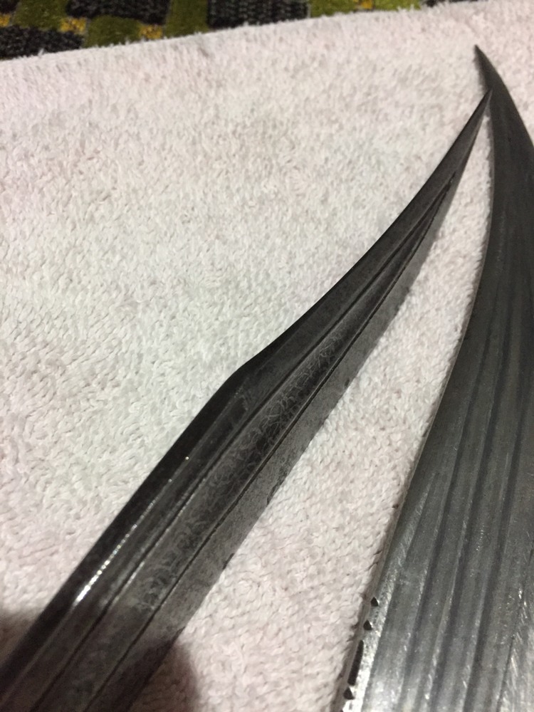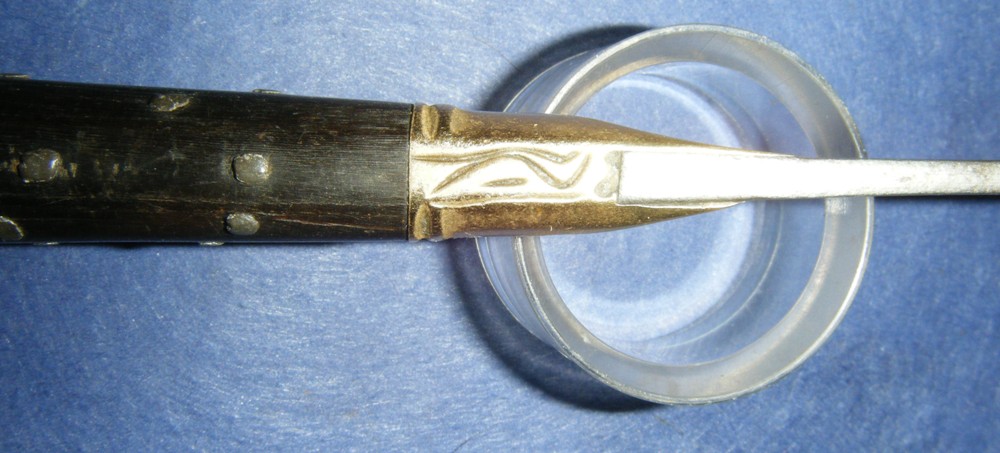 I came across this small well worked knife, handle from some sort of horn interlard with iron nails for better grip, bolster and end cap casted brass, blade is worked with care. It's very small with 18,5 cm overall, 9,5 cm visible blade length, peened blind tang. 3,6 mm thick near the handle. Weight is 44 gram. I am not firm with Ottoman knives and daggers but think that it is very Ottoman influenced!? I have seen similar knives described as Bulgarian shepherd's knives, is it such an item? See for example here: http://www.vikingsword.com/vb/showth...ight=bulgarian It look very old to my eyes. Who can help with the exact id and/or is able to tell me a little bit more about this small fellow? Regards, Detlef |