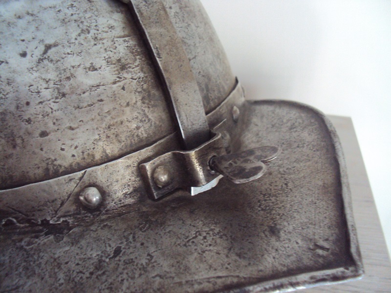 Here is my lobster tailed helmet, cavalry helmet in Europe around 1640-1660. It is the best known model, I think German, many of these helmets were kept in arsenals from what I had heard. Anyone have an idea about the manufacturer? "L"