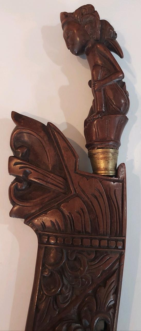 A friend recently acquired this at a local auction. The blade appears very much to be a simple working version of a wedung that has seen use. I seem to recollect discussion of the same entity as depicted by the carved hilt, but cannot recall the details. I am interested in your thoughts about origin and age.
