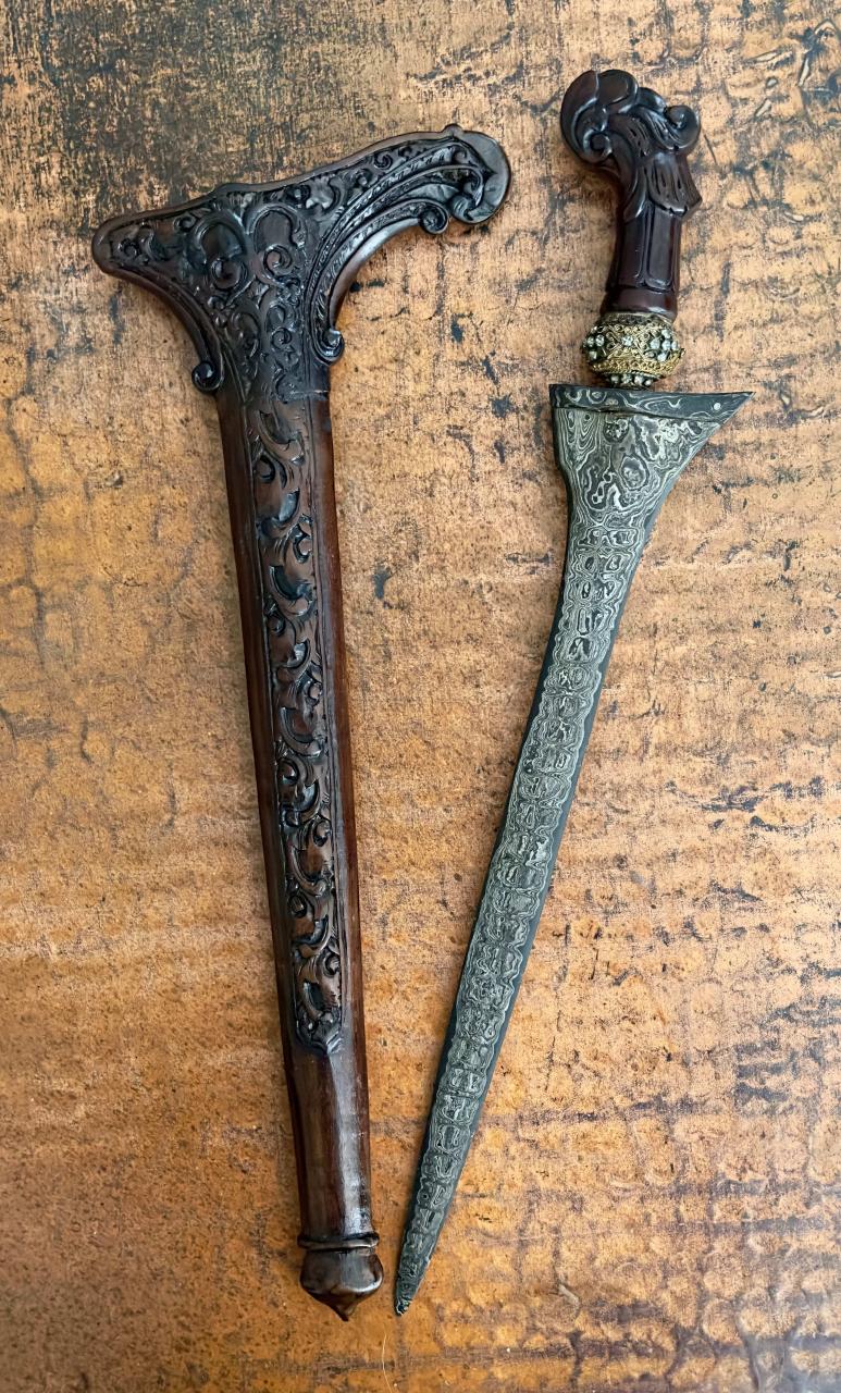 I own a Keris that was given to me by a business associate during a visit to Indonesia years ago and would appreciate any opinions as to the classification of its Dhapur and Pamor. Thanks in advance for your assistance. |