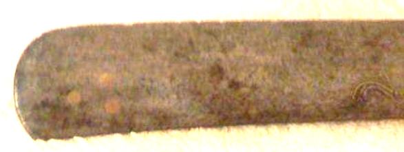 very pleased to have added a Dha to my collection . The blade is approx 7mm thick distally tapering to approx 1.5 mm. Blade is 20" long. Has a fuller with scroll work at either end (no pics ...I haven't received it yet). I noticed later, whilst 'messing around' (contrast, brightness etc) with the pictures of the blade that there seems to be 3 brass/copper coloured inserts near to the 'tip'....please what is the significance of this The wooden handle is bound with plaited grass/rattan .... no scabbard, but seems to be a good honest, functional Dha. The seller stated that this was a 'bring back' and had been in the family for some 60 years and was told it was a 'head hunting' sword. Could anyone help ID country of origin, possible age etc. ? Thank you kindly Regards David ps The sword blade may look a little 'odd' as it was photographed on a bath towel. |