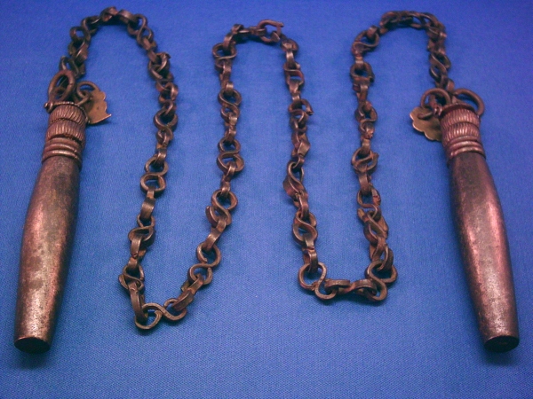 I picked this up at an antique mall for virtually nothing. I know nothing about these kinds of weapons, but this seems to be a manrikigursari: http://www.geocities.com/koryu-bujutsu/masaki.html My question is: how old is this one, and was this one intended for use? The patina on the weights seems genuine, but I can't find any constructed like these are: they have a spindle protruding from them, with the decorative washers and the means of attatching the chain threaded through the spindal. Then the spindle is flattened on the top to keep it all in place. One of the weights is missing some of the washers. From each weight is a little brass "tag," but though they're the same basic shape they are slightly different, so not machine done. The whole thing jingles when spun, which might be the point. The links of the chain itself are formed in an "s" shape, and a couple look like they've been broken and repaired. I'm happy with it, even if it's a chinese knockoff or some kind of novelty weapon. They still sell plainer ones brand new for about what I paid for it anyway. But of course if it does have any authenticity I'd love to hear it! --Radleigh |