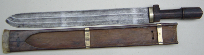 The impression which I've gleaned over the years of examining and discussing is that this type of knife is from the frontier region of lowland southern Bhutan and the northern Assam, in the watershed of the Brahmaputra River. The design of the metal ferrule reinforcing the wasp-waisted grip at the root of the blade is similar to that on the more familiar Bhutanese swords from the Tibetan-influenced highland regions of the country. The open-fronted scabbard concept is something seen in many parts of SE Asia, such as on the Kachin dao, the swords of the Taiwan highlanders, and on various "bolos" and knives of the central and northern Philippines.