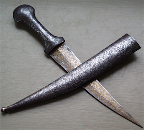 Your dagger reminds me of one of mine, see photo. I don't think these were ever intended as weapons more like a piece of masculine adornment like the sgian dhu we Scots wear with the kilt nowadays, the blade being almost secondary to the hilt and scabbard. I noticed on one of your photographs that the scabbard and hilt do not meet exactly when the dagger is sheathed, mine is the same. I think this is evidence of how it was worn, a dagger thrust into a belt/sash at the front of the body would get like this over time from the wearer bending/sitting down etc. Mine although undated is also 19thC. I think it is nice to have everyday items in ones collection as well as the spectacular. My Regards, Norman. |