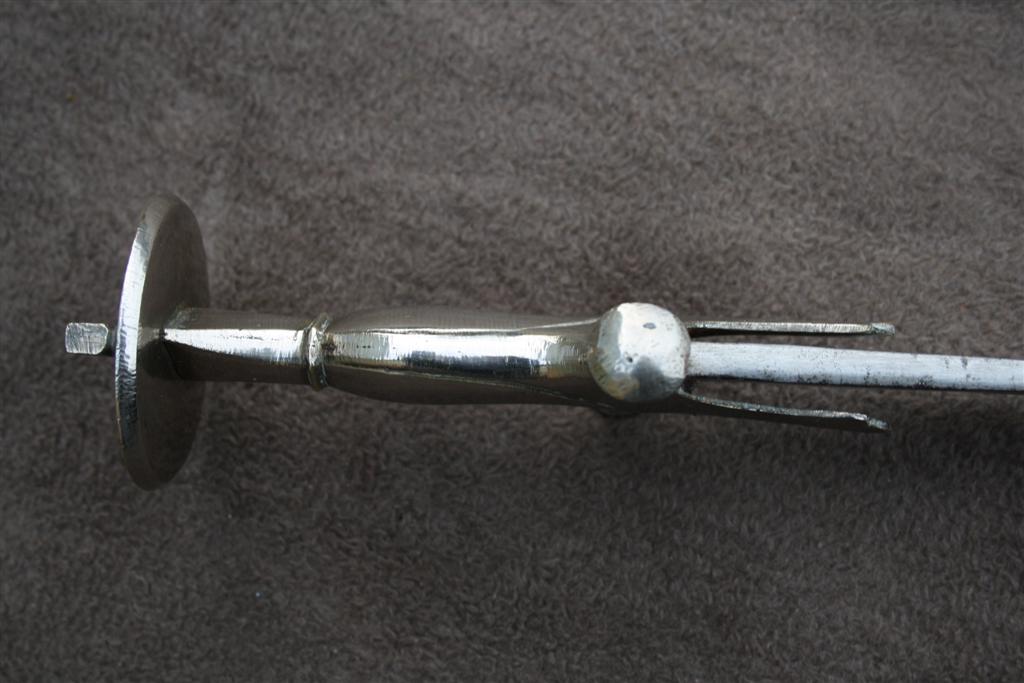 It is great to see this 'katar' stamp resurface, and we did have some great discussion concerning this in 2007, it seems in most cases this deep stamp appeared accompanied by a trisula. I think it will be OK to post the images from that thread Jens so I will add it as shown from a khanda hilted sabre...in it appears to be were rehilted with tulwar blade carrying this stamp.