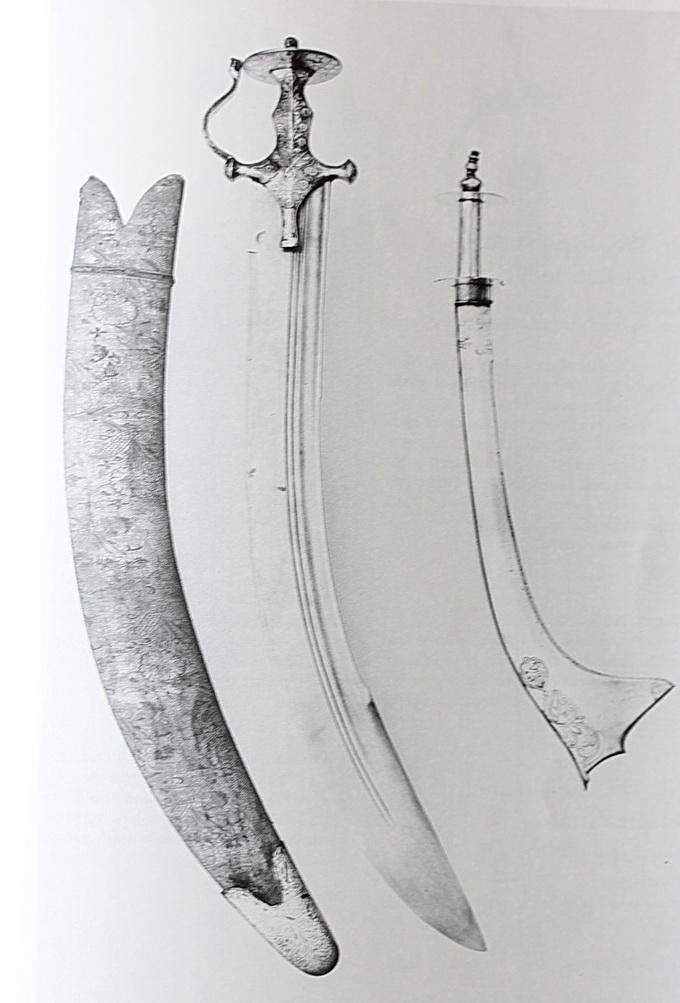 The one with heavy yelmaned blade is similar to others of this form and hilt which seem to be termed 'tegha', though the exact nature of this form has been disputed. The others I have seen like this also have the cartouche in similar location on blade near edge at langet, one is in "Islamic Arms and Armour from Private Danish Collections", Copenhagen, 1982, #174, as found in notes but I do not have the book. Unsure of what is in the cartouche but it seems oval. Another was sold in December, 2011 with similar hilt (these appear Rajasthani also) and the cartouche with illegible markings in oval. I would suggest these initials may represent the official property of one of the districts in India, perhaps these arms belonged to groups or units in certain capacity. Even many large firms and railroad agencies had thier own police or security forces. I recall that one railroad agency in Baroda even had swords made in the British M1853 pattern by Rodwell & Co. made for them. Just speculation of course, and as always, look forward to other views. Best regards, Jim |