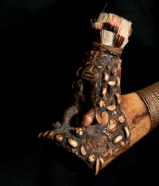 The resin at the base of the hilt is missing, the scabbard is probably not original to the mandau, the blade is very simple and pedistrian but the hilt is the one that attracts me to it. I basically bid for the hilt! Does anyone know what type of hilt/mandau is this? which tribe and region in borneo it came from? I recall there was a thread posting mandau hilts with human figures but I can't seem to find it when I did a search. |