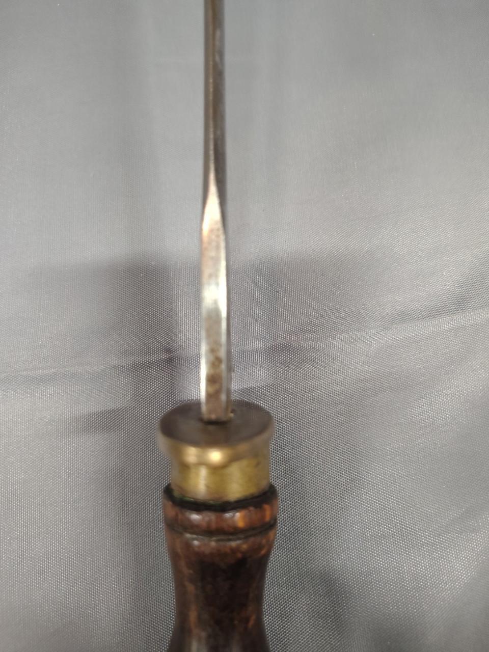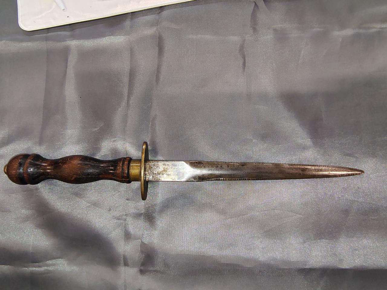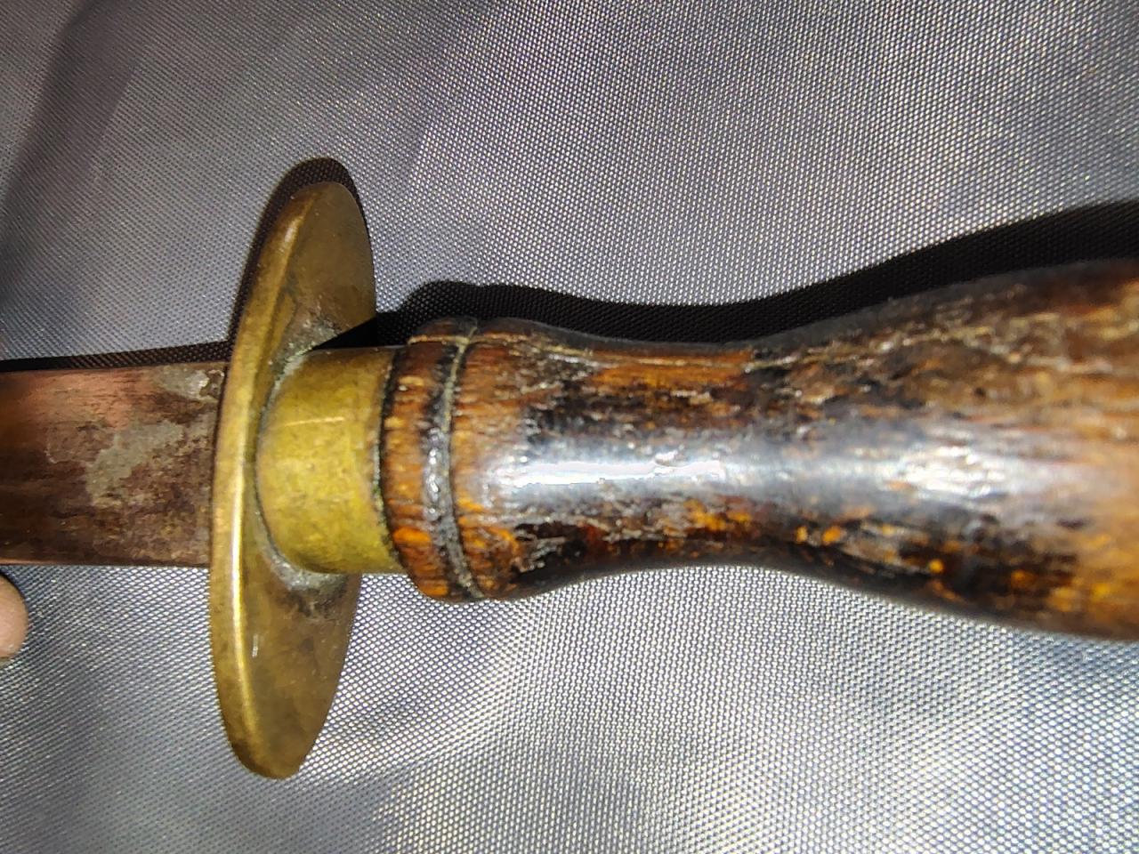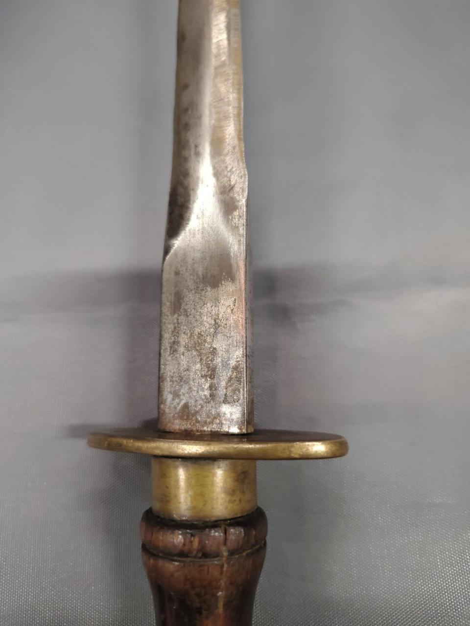 The weaponry aboard naval vessels were of course more regulated, but in the multitudes of private vessels, merchant or other, weapons were purchased by the captains through private purchase. As these were not in accord with any regulation, they might have been surplus or otherwise types in variation. The dirk, and knives in that category were sort of between a knife and short sword, and it seems private sailors often took it upon themselves to have examples of 'one off' versions, as this appears to be, crafted. It seems this kind of repurposing is rampant in all sorts of weapon forms, and ethnic or national contexts. This interesting example appears one such case with some sort of perhaps furniture element for hilt and cut down blade, possibly a bayonet. It seems the blade length would be short for a dirk though, in my experience these were usually 12" or more. |