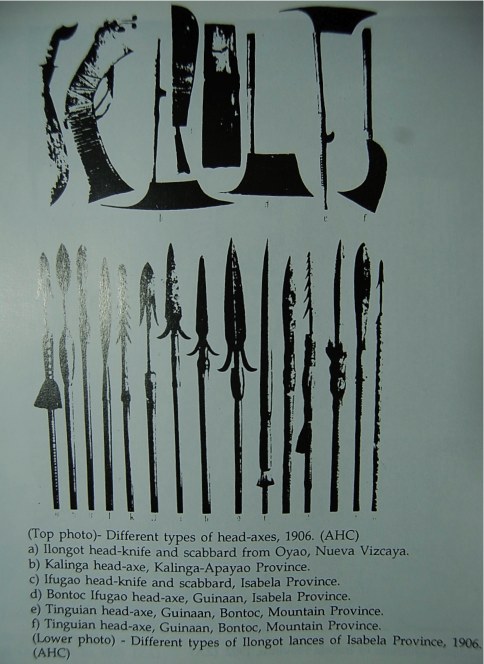 Here's another bit of info that may support the possibility of the Cordillera [highlands] axe originating from the Cagayan-Isabela [lowlands] area, as you intimated. For info of everyone, both Cagayan and Isabela provinces are adjacent to and east of the Cordilleras. In Samuel K. Tan's A History of the Philippines (1987), Tan outlined the patterns of leadership per ethnic group: "The Ivatan of the Batanes islands developed a system in which two leaders shared authority ... The Ilocano observed a power arrangement in which the babacnang or amaen ti ili exercised dominant influence and power. The Igorot setup consisted of the Apo who performed roles with authority ... The Ilongot, a neighbor of the Igorot, had a sort of 'familial government' ... Somewhat different was the Zambal political arrangement which simply gave the best and recognized fighting man the honor of being the leader. The Gaddang [i.e., one of the Cagayan natives] of Northern Luzon developed a setup in which the best headhunter, called the mingal, exercised dominant authority ...."Again the proposed proof is indirect, given the scanty info we have. But the logic goes like this -- if headhunting was most celebrated in Cagayan, then perhaps the skills and weapons needed in headhunting were also most developed in Cagayan; therefore, the headhunter's axe's original design may have come from Cagayan, and from there the axe's design just evolved as the axe was adopted by the neighboring provinces. Of course it does not necessarily follow that the headhunting weapon of choice for the Gaddangs was the axe. It could have been a bolo. But on the other hand, it could have been an axe, too. Just thinking out loud ...