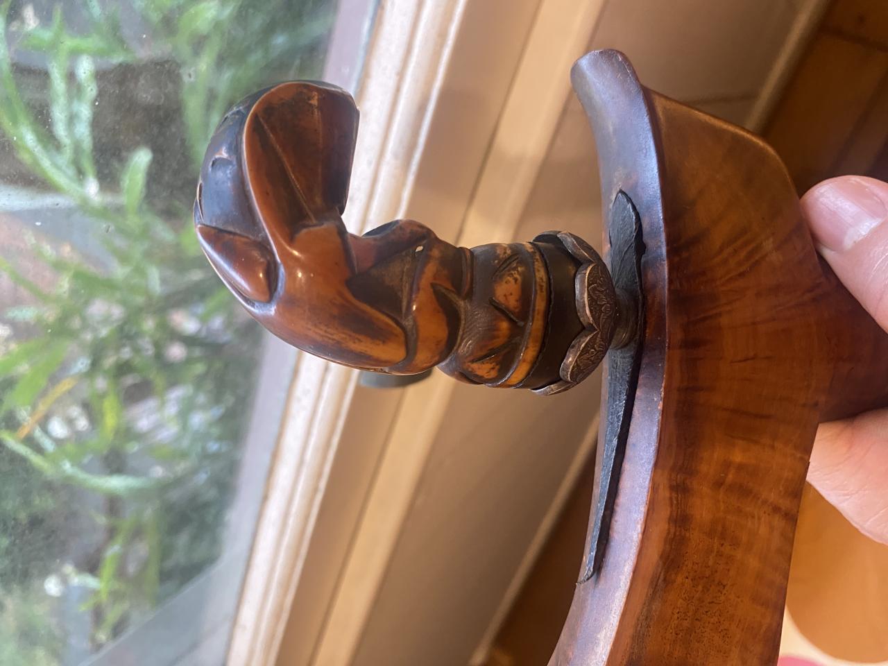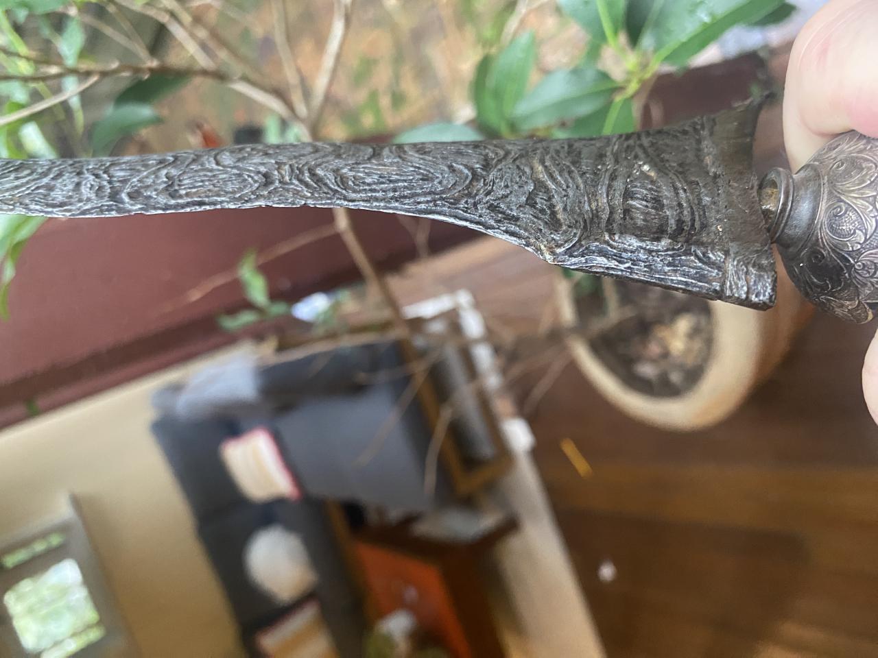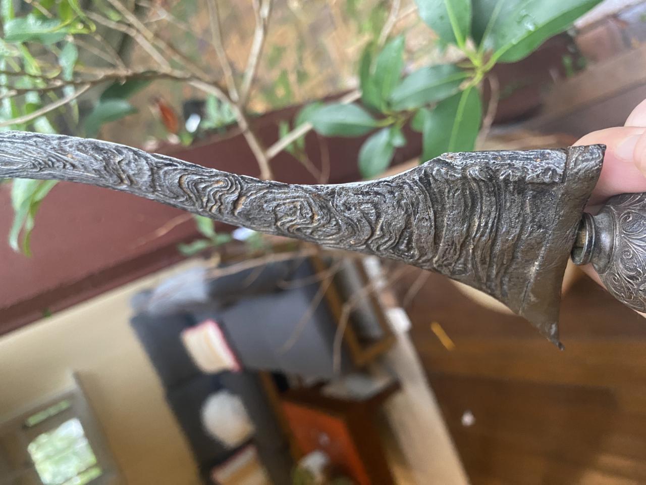 Obviously Malay dress (sheath not that old, I think); old ivory Jawa demam hilt (inset eyes missing). Old Malay hilt cup. Blade is slender and dainty and looks to me like the Javanese pamor lawe saukel; overall seems like a Javanese product. Blade is old, but has been well-fitted to the Malay-type sheath. I would be grateful if anyone is willing to share their opinion on this one. Cheers |