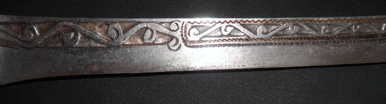 The top one I got a while ago. It's in almost perfect condition, 36" blade. It seems to be the most refined of the three. The middle one has an enormous 40" wide, much heavier blade, almost 1cm thick. The decoration appears to be somewhat cruder than the first. It lost the brass sheet decoration it once had on the hilt, evidenced by the tacks that are left in the handle. It's nice to see the actual construction of the hilt, the tang is very thin compared to the blade and bolster. Chregu showed a very similar flyssa recently, but his does not show any trace of tacks on the hilt and it may have never had brass decoration. The bottom one is the crudest I find. Its decorative elements are larger and simpler. It still has brass on the hilt, but the panels are crudely decorated. What's also interesting is the proportion of the handles. The handle on this piece is smaller and more slender than on the other two, even though the blade is almost as heavy as the middle one and just over 39" long. The width of the blade makes me wonder...perhaps the narrower blades are simply worn down from many sharpening and were once wider like the middle one. Overall I'm very torn about what these three flyssa can tell us about time and manufacture. Are the differences indicative of different craftsmen, styles or decline over time? Camille Lacoste-Dujardin has conducted an artistic and thematic analysis of flyssa's decorative treatment, but her work Sabres Kabyles (1958) does not include photos of her sample, some of which are provenanced and dated. Comments? Emanuel |