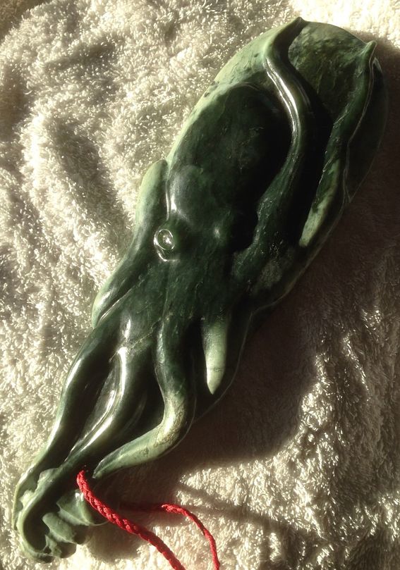 HERE IS A MODERN MERE MADE AS AN ARTISTIC PIECE AND BASED ON A OLD POLYNESIAN LEGEND. THE ARTIST FASHIONED IT FROM JADE AND MADE IT WITH AN OCTOPUS ON IT. THE GIVEN LEGEND WAS OF A LEGENDARY POLYNESIAN NAVIGATOR NAMED KUPE WHO DISCOVERED NEW ZEALAND WHILE HE WAS CHASING A TROUBLESOME WHEKE (OCTOPUS). THE OCTOPUS HAD BEEN EATING ALL THE FISH IN KUPE'S HOMELAND OF HAWAIKI. THE OCTOPUS WAS FINALLY CONQUERED WITH A PADDLE. THE MERE IS 11.5 INCHES LONG X 4 IN. WIDE AND 1.25IN. THICK MADE OF NEW ZEALAND JADE I BELIEVE IT TO BE A TYPE REFERED TO AS FLOWER JADE AND IS USED IN JEWLRY AND HAS VARIOUS COLORS AND PATTERNS. IT IS NOT CURRENTLY FOR SALE BUT I AM NOT SURE IF IT HAS BEEN SOLD OR SIMPLY TAKEN OFF THE MARKET. I THINK IT IS A UNUSUAL EXAMPLE OF A MODERN ETHNOGRAPHIC ART PIECE MADE IN NEW ZEALAND. IT IS CALLED KUPE'S MERE I DON'T KNOW IF THE LEGEND IS A OLD ONE OR MODERN ONE BUT IT MAKES A GOOD STORY