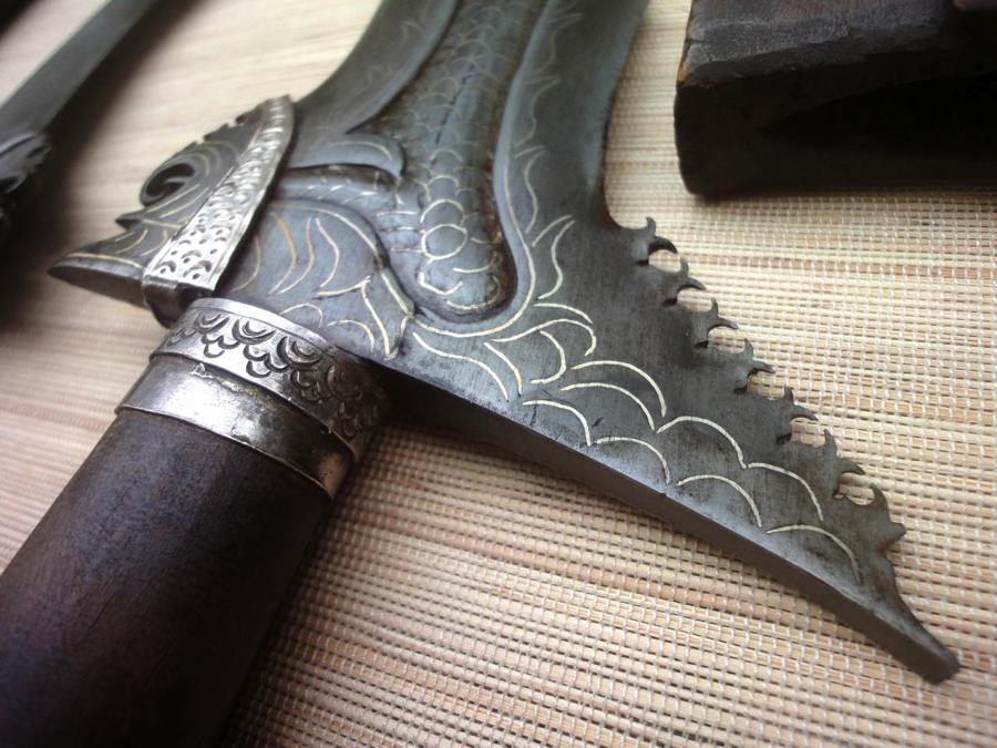it's this particular naga inlay i'm referring to: ![]() i've never seen it on a kris before, although it's relatively common on barungs: http://www.vikingsword.com/vb/showthread.php?t=11110 the naga incised on the sorsoran (to borrow the keris terminology) of the above kris is somewhat similar to yours. |