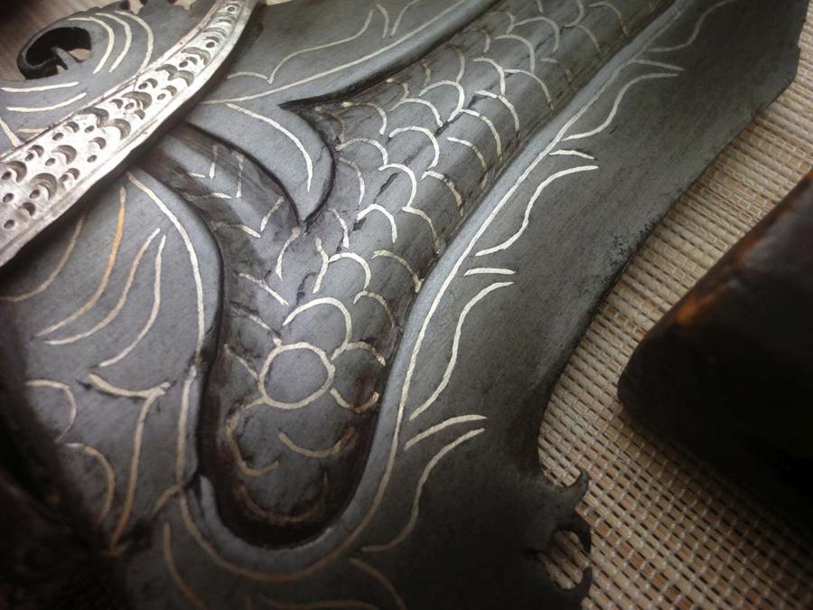 ![]() I'm not sure what you mean, but my kris has the naga inlay all along the blade, with its tail ending almost at the tip. Best, |