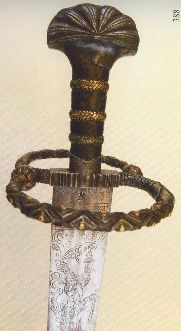 The blade is struck with an imitation of a Brescian eye mark which however is located too high up for a genuine piece, just below the quillons. The etching on the blade again is typical of the Historismus period, showing a warrior all'antica.