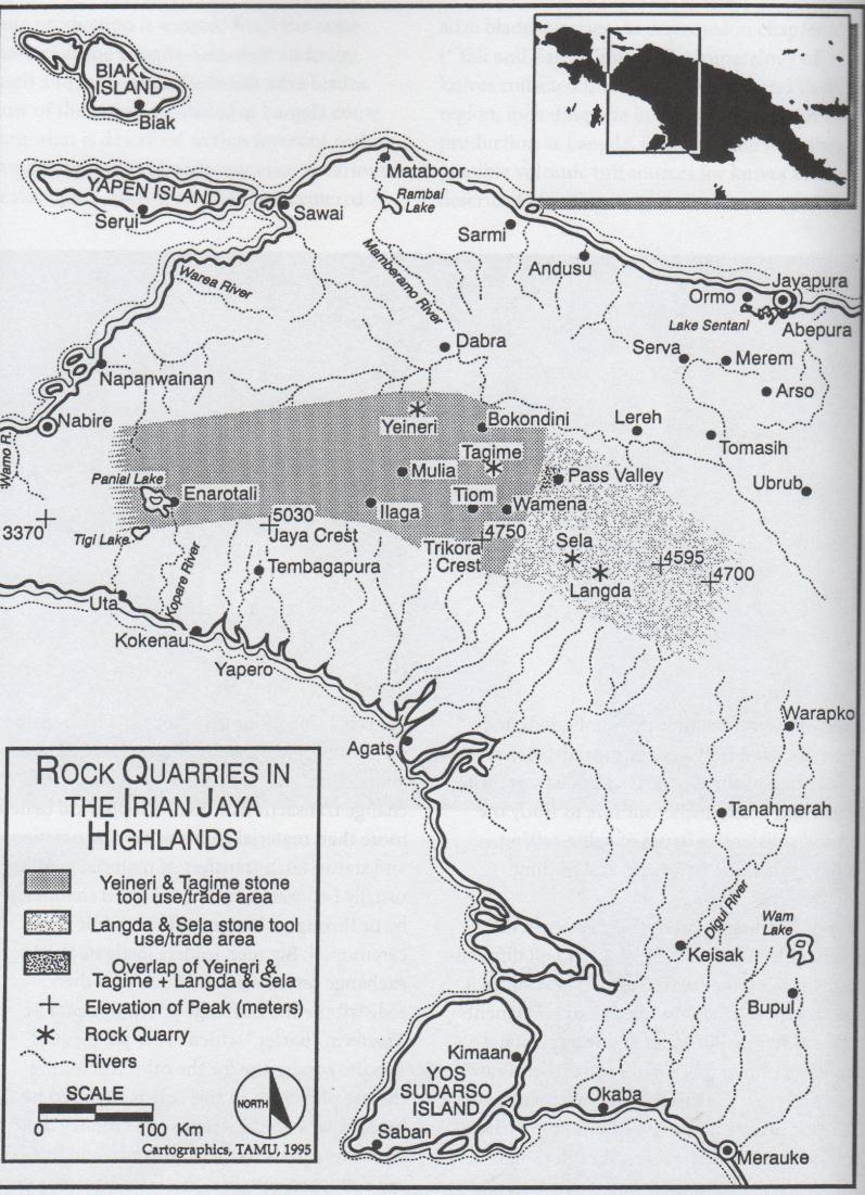 In earlier times the trade routes went from coast to coast through the highlands. Mr Hampton has concentrated his study to one area where stone still plays a the major role in the cultural and economic lives of the people in the late 20th century to today . In the study there is no mention of Nephrite. Just the stone of a similar make up that can be of the same hardness.