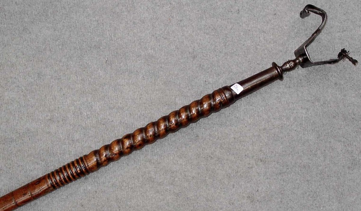 Musket rests, which were in use from the early 16th to the mid-17th c., normally had scrolled upper finials to avoid harm. There were some early types though to feature one spiked end which served as a thrusting weapon.