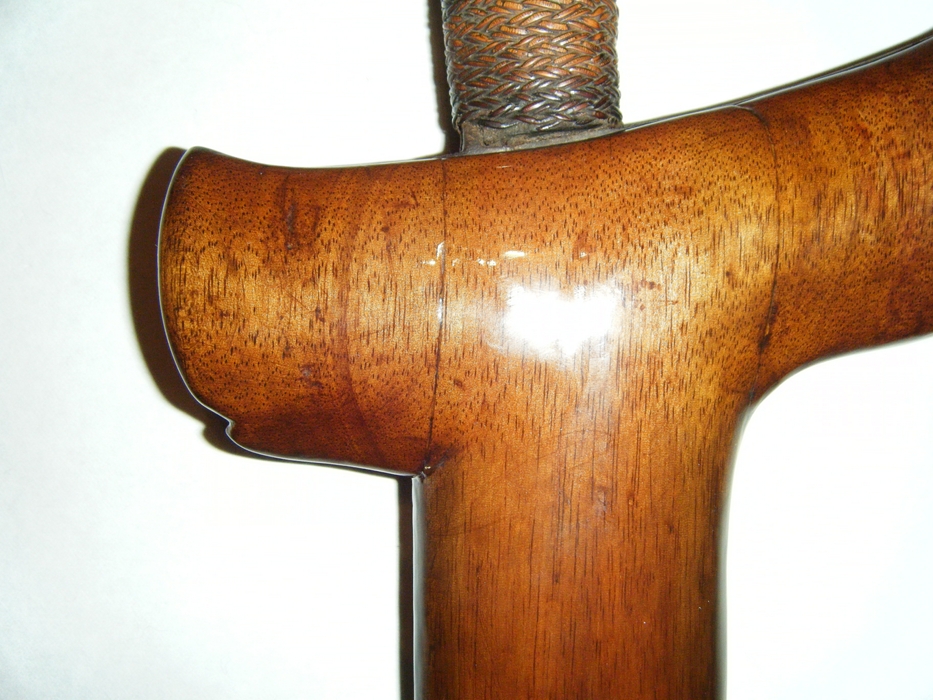 I am with you, I have seen protective coatings only by keris sheaths and by some few other weapons but never by this weak wood scabbards from Philippine kris. This weak wood is the reason why they are so many times are broken IMHO. Like you can see in last pic. from post # 16 and post # 22 there was done also a bigger repair at the crosspiece and the scabbard was heavily cratched (see pictures from the seller in up) so we decided to remove the old coating from grease and give it a finish with shellac. Not original anymore but kept the original scabbard in a way which will be save also for a time after my ownership. In my eyes a acceptable trade-off.