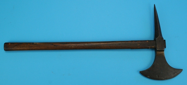 This is an all steel horsemans axe of later 16th or earlier 17th century type that I used to own. It is of the type commonly seen in Western Europe and includes a belt hook. It is not particularlly long as I recall perhaps 20 inches which indicates to me that it was not necessarilly meant for downward strokes at opponents on the ground ( this would cause the rider to bend down in a somewhat awkward manner to do so which a longer sword would not ) but for use against a level opponent, ie. another mounted man. I would be currious to know the dimenstions of the original axe posted as the pic does give it the impression of being somewhat long in the haft. The fluke/backspike on this example was not only pointed but actually sharpened meaning that the edges of the fluke had been sharpened to an edge.