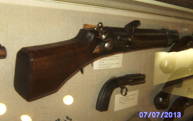 Stadtmuseum Wangen im Allgäu, Bavaria, Germany keeps a curios object. The piece is described as Pertinal-Brustkarabiner (breast carbine) with a barrel dating to the late 15th century, the shaft and a French Batterieschloß (flint lock) with double set trigger were added around 1730.