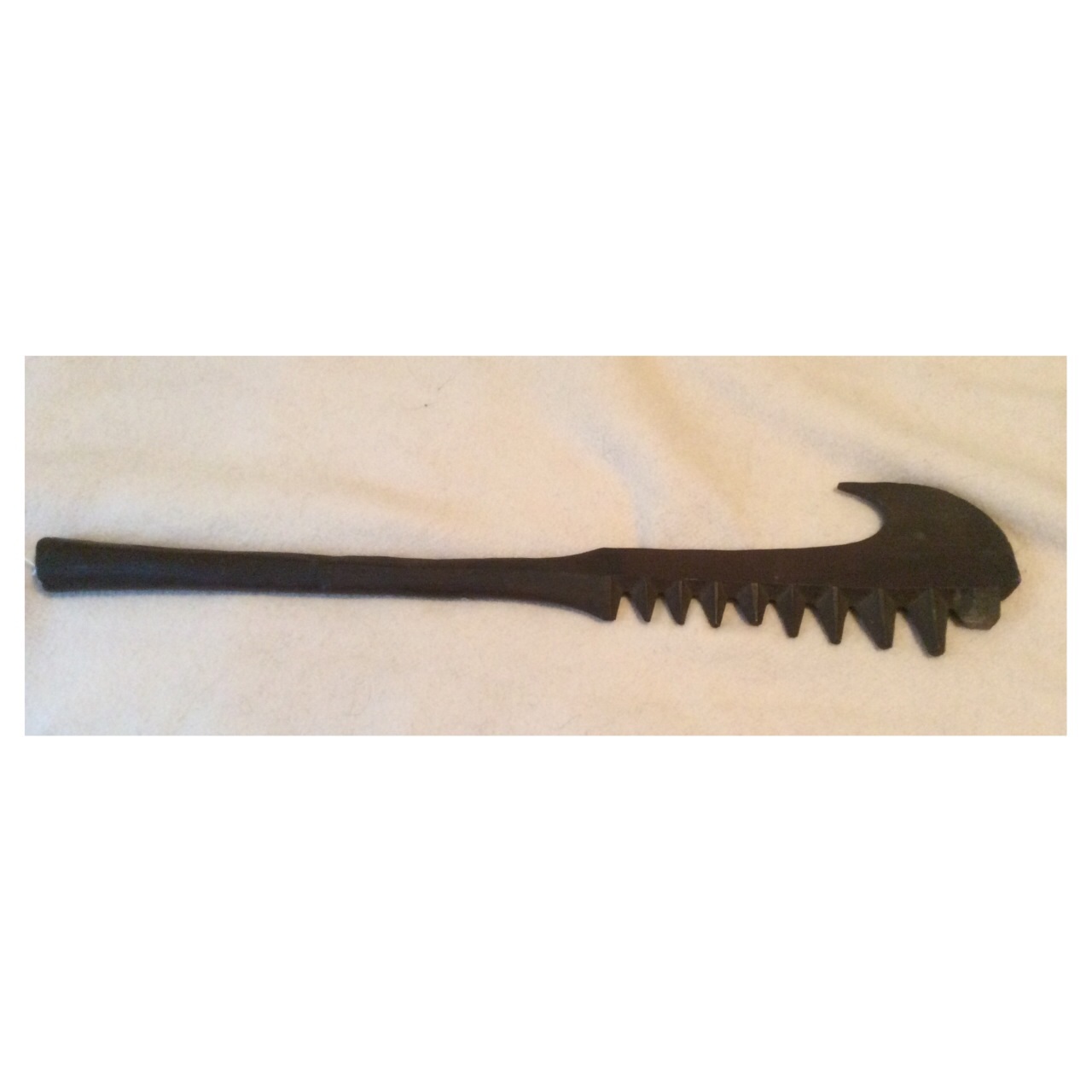 There's nothing tourist-market about it. The piece appears to be riven from a log and scraped/whittled into shape. It appears to be made of a somewhat light colored wood that has aged to a dark brown. The wood does not seem to be as dense as palm or other Pacific woods typically used in clubs. There is an old scar where a piece split off of the handle. I tried to show this. An iron staple was hammered into the butt a long time ago, probably for decor enhancement.
