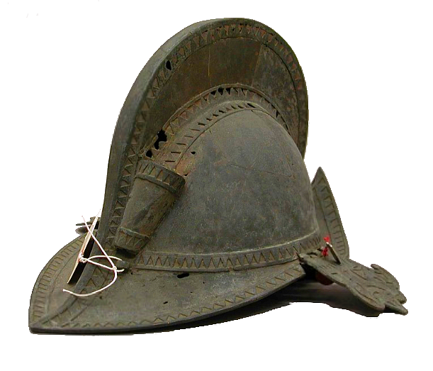 It has a wide brim, upturned and pointed at both ends. The brim is attached to the rest of the helmet by means of rivets all the way round the heads of which