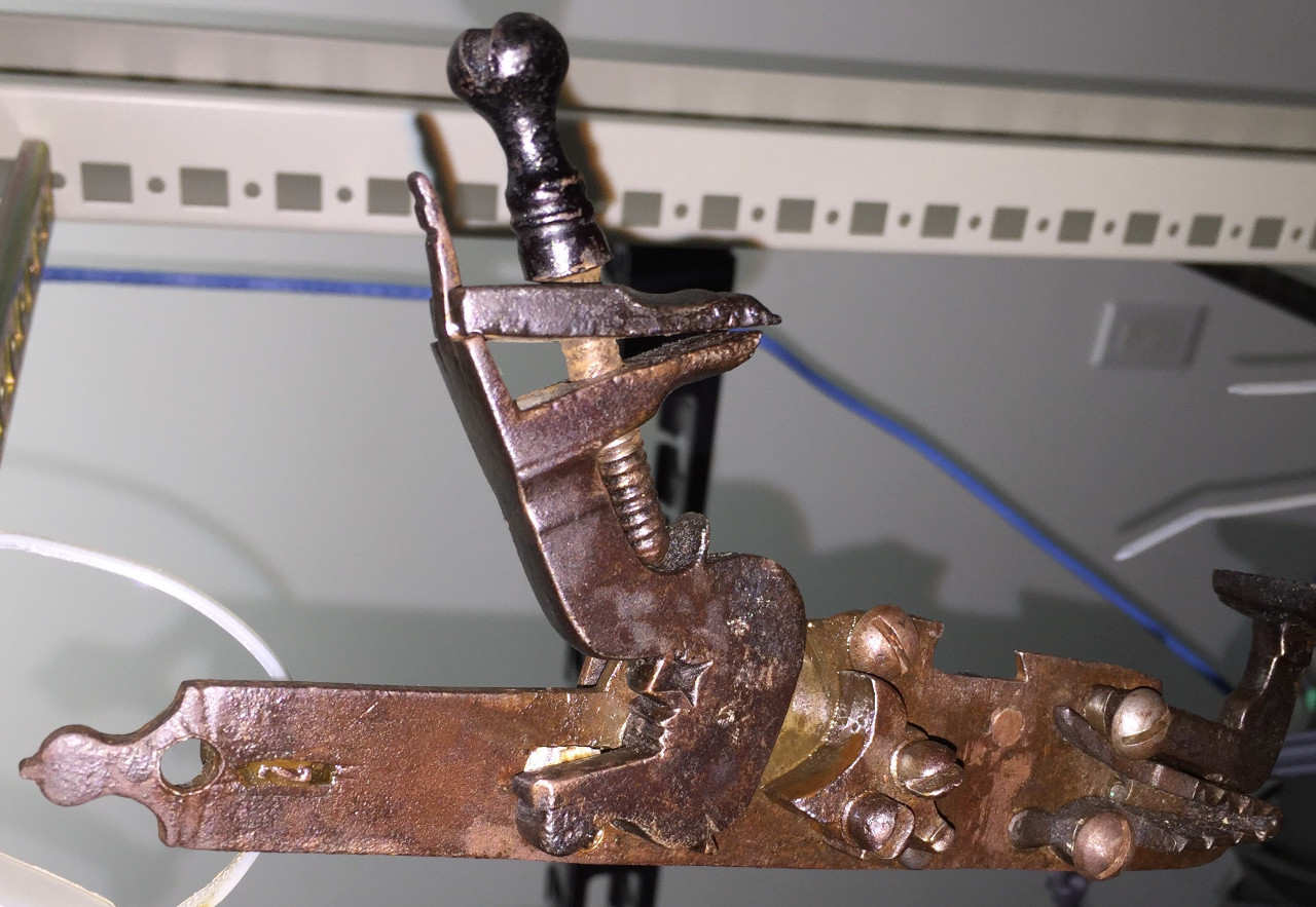 From what I can tell, the North African snaphaunces are copies of originals traded with Morocco (indeed, sometimes with the specific aim of buying the Sultan's favour) during the 16th and 17th centuries by the English and Dutch. They copy these designs in most details, right down to the button-shaped "fence" or guard on the outside of the pan. So far, so good, except that the mechanisms aren't alike. On the European prototypes, the sear, pivoting horizontally and with its nose passing through the lockplate, engages the tail of the cock to hold it at the cocked position; indeed, that is the express function of the tail. On the North African derivatives, however - or at least, on mine, yours, and any others I've seen in photos or museums - the sear does not engage the tail. In my lock, it engages with a large slot, either cut into the cock after casting or, more likely, included in the original casting. The entire system reminds me slightly of wheel-lock mechanisms, with the sear pressing against a rounded detent to allow it to release easily when the trigger is pressed. On these snaphaunces, the net result is that the sear nose and the cast slot wear down to the point where they're both nicely rounded, at which point the whole mechanism ceases to function. When fettling this musket, I plan to see if I can rebuild the nose slightly so that the sear can actually hold the cock back. |