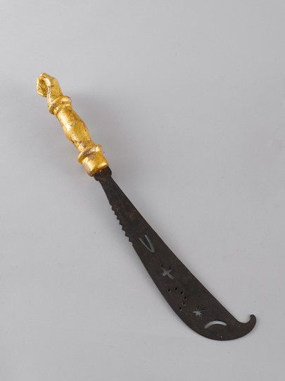 Description. A state sword (afena) with slightly curved cast iron blade, pierced along the lower cutting edge with two arrow-shaped voids and an equal-arm cross motif. These voids are surrounded by punched line and dot patterns. Near the hilt there are two incised grooves filled with a herringbone pattern and five circular punch marks. The wooden hilt is bar-bell-shaped and has distinctive rounded pommels either end of the grip. The hilt is decorated with a series of carved geometric designs which were originally covered with gold leaf secured by small gold-covered (?) staples but only a small amount remains in place. Dimensions Length: 34 centimetres Width: 4.5 centimetres Condition Fair, extensive loss of gold leaf on carved hilt, with remianing traces in a fragile condition. Curator's comments It is not known when swords were introduced into area now known as Ghana but early examples probably derive from Islamic weapons that were passed down the trans-Saharan trade routes. The use of swords in Akan society was recorded by the end of the sixteenth century and they have continued to play a significant role in ritual and ceremonial contexts ever since. There are several distinct types of state swords normally found in the regalia of an important leader or paramount chief. By far the most important of the ceremonial swords are the keteanofena (literally; edge of the sleeping mat swords) which are revered and are passed from one ruler to his successor as a major portion of state regalia. This group is composed of two major sub-divisions the akrafena and the bosomfena. Akrafena, or ‘swords of the soul’ are used, as their name suggests, in fairly restricted, often private rituals for the purification of the ruler’s soul and the purification of the blackened state stools while swords in the second division the bosomfena play a more varied and public role. These two groups of swords embody and represent two distinct spiritual elements; those on the Asantehene’s right (akrafena) represent his soul or life-force (kra), those on the left (bosomfena), his ego, spirit or personality (sunsum) that was inherited from his father. Elders also swear allegiance to their ruler on these swords and they may be carried as badges of office for a ruler’s messengers. This small sword is the same shape as the larger state swords which suggests that it functioned in a similar way." Unquote. Last edited by Ibrahiim al Balooshi; 28th August 2017 at 02:57 PM. |
