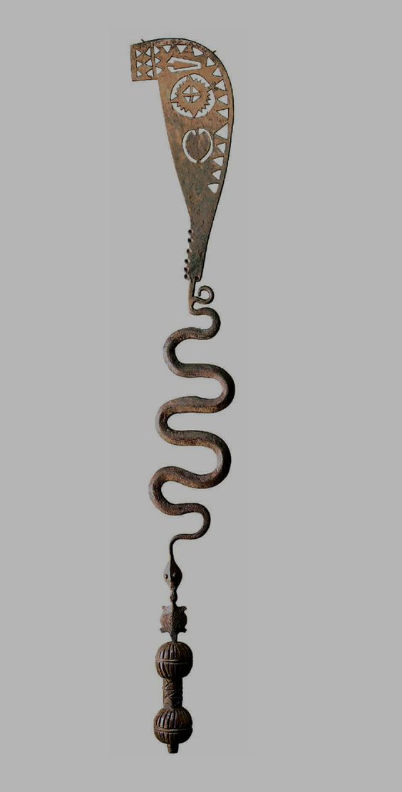 These with that distinct cross pierced in the blade seem most prolific and if I understand correctly, it is one of the varied symbols which may be connected to the Vodun religion (later Voodoo in Louisiana and Caribbean) of the Fon and Yoruba people among others. As in many ethnographic circumstances this cross symbolizes the four cardinal directions and similar meanings. Thank you for that cite as well..it really helps to have these additional references to add to the material being reviewed. |
