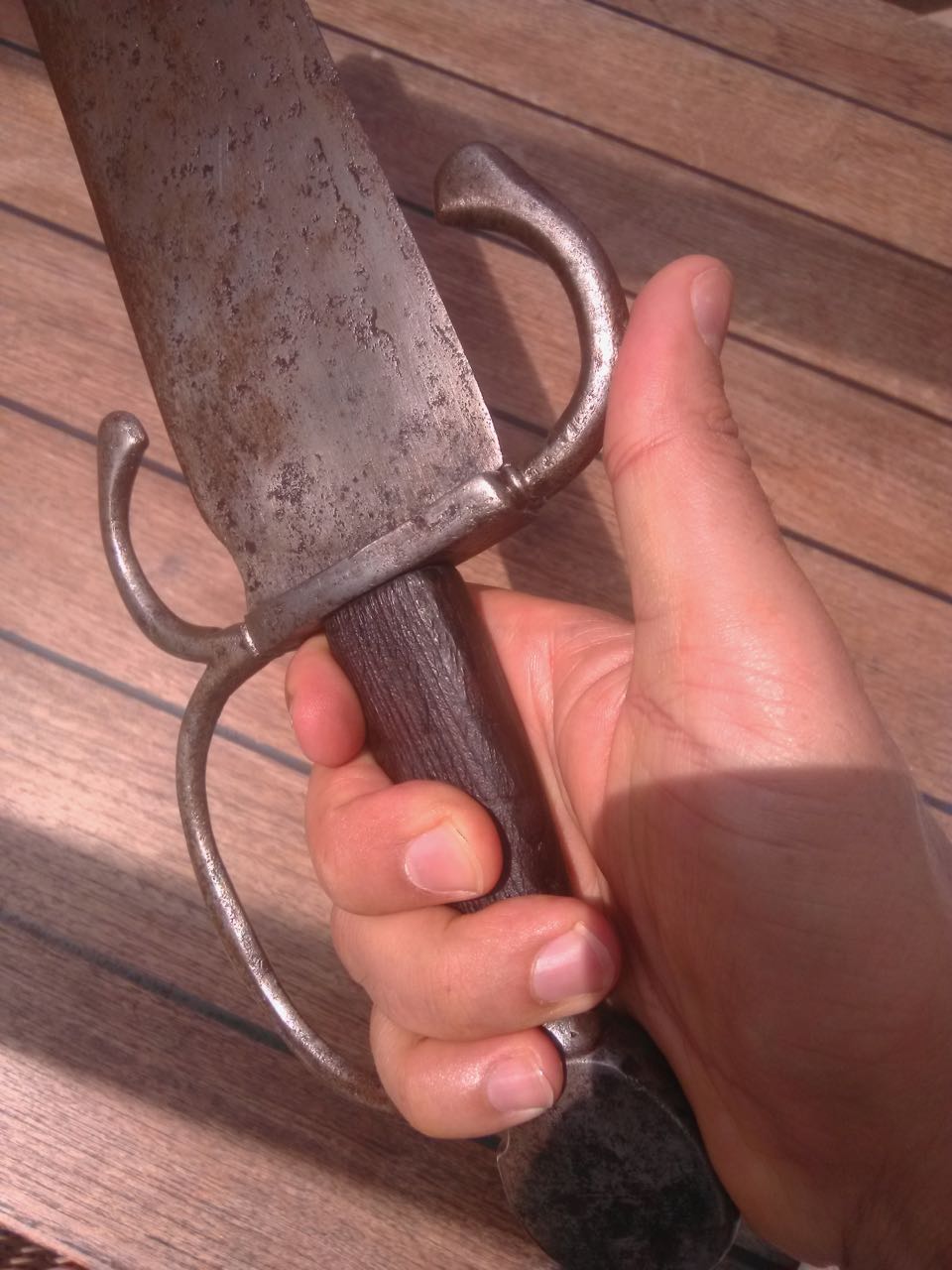It looks like a typical Venetian storta grip, 16-17thC. The blade is slightly unusual shape but obviously for cutting rather than thrusting. I have seen a German felddegen/haudegen with a completely rounded tip so not that strange. I have also seen a Styrian dussack with very similar metal condition and markings (eye lash, etc) which was end 16thC. It seems there’s a little space on the ricasso on which to lay the index finger to improve the grip and balance, which would argue for a fighting sword.
