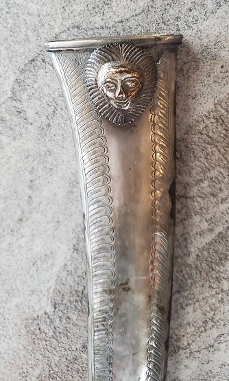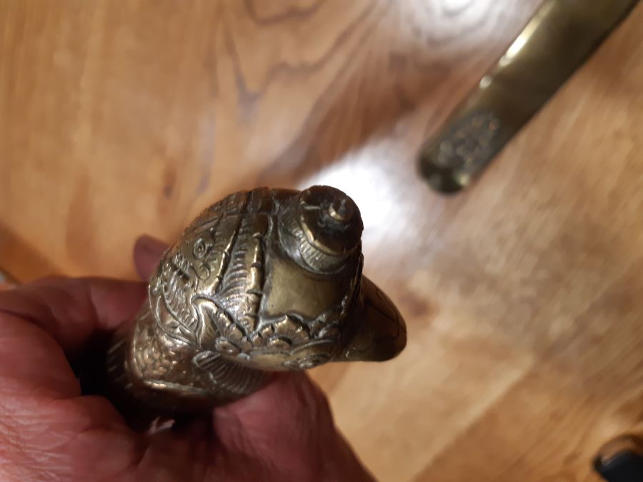 Small correction. The scabbard is made out of one piece of brass, folded en soldered.
