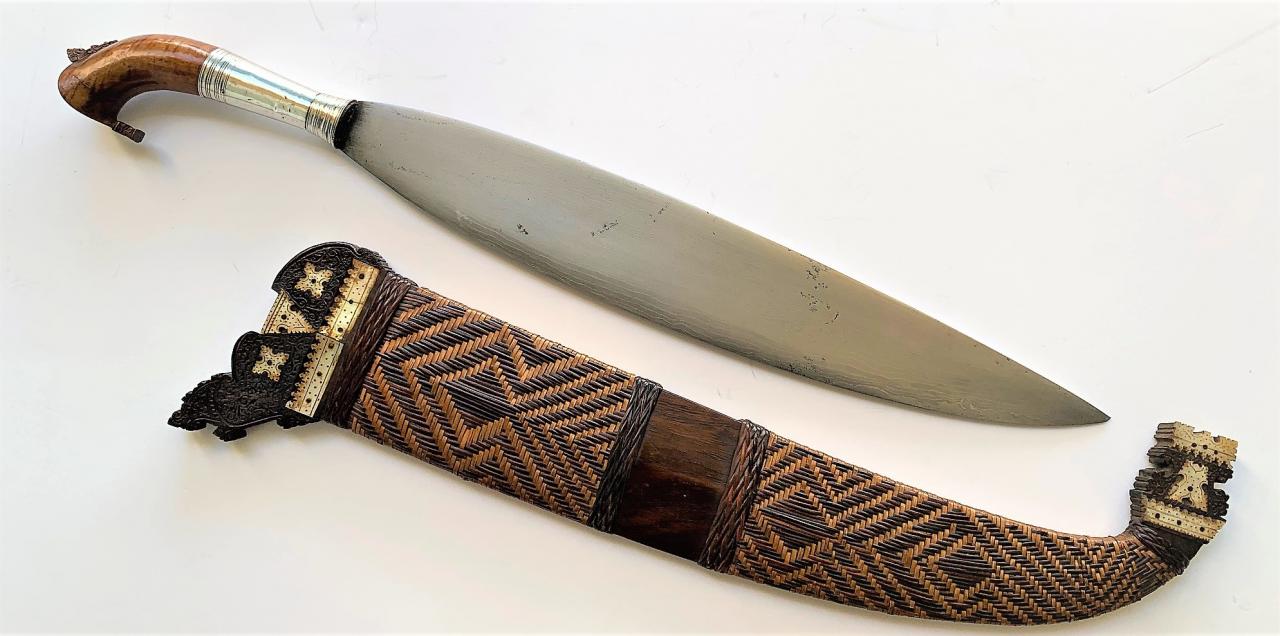 This old Moro barong/barung is a recent purchase, and when it arrived it was a very nice surprise. I knew it was an old, perhaps 19th century, Tausug Moro or Samal Moro barong in a later, mid-20th-century, scabbard. What I did not anticipate was the outstanding quality of the beautifully laminated blade. The laminations are very precisely done and almost remind one of the rings in a tree trunk...I even wonder if that was the inspiration for this sort of pattern weld. This is one of the rarer forms of pattern welding on a Moro barong blade; I believe only a twistcore pattern weld on a barong is rarer.