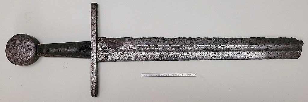 Below are the remains of a sword of similar form bearing an +INNOMINIDOMINI+ iron inlay; the ruler is 4 inches:
