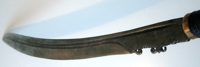 "... I think that the parang on the link above is more related to this kind of non-documented Iban sword than the one on Artzi's site? And the hilt form looks more like the rare kind shown in Iban Art pict.135 or Coppens page 73 (far right)." Another one of my pseudophilosophical ramblings: Why do we always try to pigeonhole every weapon into some predefined niche? "This one is a Niabor, this one is a Jimpul, and that one is undefined or undocumented" Do not get me wrong: it is important to know a correct name for many reasons, but these swords were made by hand, by illiterate village smiths who never belonged to trade guilds, had no manuals, no strict standards and no ethnographers standing behind their backs and ordering them to increase the angle just a bit to conform to Pic. X on Page Y in book Z. Of course, every one of them had just a gestalt of what a mandau ( or anyrhing else) should look and just spiced it up from time to time with a crenellation here, a curlicue there and a recurve blade if he had a pariculatly good drink last evening. The more we look at the swords, the more variability we find even within the same class. Not a miracle: it is an art first and foremost, and real art lets imagination run wild. I just wonder what real head-hunting Dyaks from the 19th century would call this sword. Probably just "A Sword". |