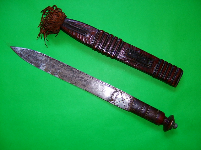 I believe what identifies these more than anything else is the leather work on the scabbard. After seeing a number of fine examples at museums,shows and in books you just develope an eye for the finer details. Although the leather work on the older swords and daggers (19th century pieces) seems to be of a finer quality than those of the early to mid 20th century at least in my opinion. Below is a good quality 19th century sword with similar leather work quality as found on the above dagger.